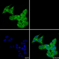Immunofluorescent analysis of FHL2 staining in MCF7 cells. Formalin-fixed cells were permeabilized with 0.1% Triton X-100 in TBS for 5-10 minutes and blocked with 3% BSA-PBS for 30 minutes at room temperature. Cells were probed with the primary antibody in 3% BSA-PBS and incubated overnight at 4 °C in a hidified chamber. Cells were washed with PBST and incubated with a AF488-conjugated secondary antibody (green) in PBS at room temperature in the dark. Phalloidin - AF594 was used to stain Actin filaments (red). DAPI was used to stain the cell nuclei (blue).