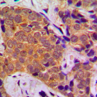 Immunohistochemical analysis of FOXO1 staining in human breast cancer formalin fixed paraffin embedded tissue section. The section was pre-treated using heat mediated antigen retrieval with sodium citrate buffer (pH 6.0). The section was then incubated with the antibody at room temperature and detected using an HRP conjugated compact polymer system. DAB was used as the chromogen. The section was then counterstained with haematoxylin and mounted with DPX. -