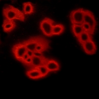 Immunofluorescent analysis of FPR1 staining in MCF7 cells. Formalin-fixed cells were permeabilized with 0.1% Triton X-100 in TBS for 5-10 minutes and blocked with 3% BSA-PBS for 30 minutes at room temperature. Cells were probed with the primary antibody in 3% BSA-PBS and incubated overnight at 4 °C in a hidified chamber. Cells were washed with PBST and incubated with a AF594-conjugated secondary antibody (red) in PBS at room temperature in the dark.