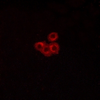 Immunofluorescent analysis of FSHR staining in MCF7 cells. Formalin-fixed cells were permeabilized with 0.1% Triton X-100 in TBS for 5-10 minutes and blocked with 3% BSA-PBS for 30 minutes at room temperature. Cells were probed with the primary antibody in 3% BSA-PBS and incubated overnight at 4 °C in a hidified chamber. Cells were washed with PBST and incubated with a AF594-conjugated secondary antibody (red) in PBS at room temperature in the dark.