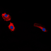 Immunofluorescent analysis of Gastrin staining in HeLa cells. Formalin-fixed cells were permeabilized with 0.1% Triton X-100 in TBS for 5-10 minutes and blocked with 3% BSA-PBS for 30 minutes at room temperature. Cells were probed with the primary antibody in 3% BSA-PBS and incubated overnight at 4 °C in a humidified chamber. Cells were washed with PBST and incubated with a DyLight 594-conjugated secondary antibody (red) in PBS at room temperature in the dark. DAPI was used to stain the cell nuclei (blue).