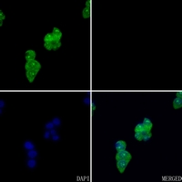 Immunofluorescent analysis of FYB staining in MCF7 cells. Formalin-fixed cells were permeabilized with 0.1% Triton X-100 in TBS for 5-10 minutes and blocked with 3% BSA-PBS for 30 minutes at room temperature. Cells were probed with the primary antibody in 3% BSA-PBS and incubated overnight at 4 °C in a hidified chamber. Cells were washed with PBST and incubated with a AF488-conjugated secondary antibody (green) in PBS at room temperature in the dark. Phalloidin - AF594 was used to stain Actin filaments (red). DAPI was used to stain the cell nuclei (blue).