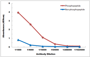 Direct ELISA antibody dose-response curve using Anti-FYN (Phospho-Y530) Antibody. Antigen (Phosphopeptide and non-phosphopeptide) concentration is 5 ug/ml. Goat Anti-Rabbit IgG (H&L) - HRP was used as the secondary antibody, and signal was developed by TMB substrate.