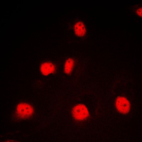 Immunofluorescent analysis of GATA1 staining in K562 cells. Formalin-fixed cells were permeabilized with 0.1% Triton X-100 in TBS for 5-10 minutes and blocked with 3% BSA-PBS for 30 minutes at room temperature. Cells were probed with the primary antibody in 3% BSA-PBS and incubated overnight at 4 °C in a humidified chamber. Cells were washed with PBST and incubated with a DyLight 594-conjugated secondary antibody (red) in PBS at room temperature in the dark.