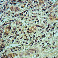 Immunohistochemical analysis of GNL1 staining in human liver cancer formalin fixed paraffin embedded tissue section. The section was pre-treated using heat mediated antigen retrieval with sodium citrate buffer (pH 6.0). The section was then incubated with the antibody at room temperature and detected using an HRP conjugated compact polymer system. DAB was used as the chromogen. The section was then counterstained with haematoxylin and mounted with DPX.
