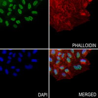 Immunofluorescent analysis of GPR38 staining in H460 cells. Formalin-fixed cells were permeabilized with 0.1% Triton X-100 in TBS for 5-10 minutes and blocked with 3% BSA-PBS for 30 minutes at room temperature. Cells were probed with the primary antibody in 3% BSA-PBS and incubated overnight at 4 °C in a hidified chamber. Cells were washed with PBST and incubated with a AF488-conjugated secondary antibody (green) in PBS at room temperature in the dark. Phalloidin - AF594 was used to stain Actin filaments (red). DAPI was used to stain the cell nuclei (blue).