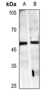 Western blot analysis of GPR38 expression in HCT116 (A), HuT78 (B) whole cell lysates. (Predicted band size: 45 kD; Observed band size: 50 kD) -