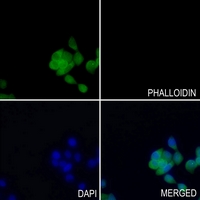 Immunofluorescent analysis of GSK3 beta (Phospho-S9) staining in MCF7 cells. Formalin-fixed cells were permeabilized with 0.1% Triton X-100 in TBS for 5-10 minutes and blocked with 3% BSA-PBS for 30 minutes at room temperature. Cells were probed with the primary antibody in 3% BSA-PBS and incubated overnight at 4 °C in a hidified chamber. Cells were washed with PBST and incubated with a AF488-conjugated secondary antibody (green) in PBS at room temperature in the dark. Phalloidin - AF594 was used to stain Actin filaments (red). DAPI was used to stain the cell nuclei (blue). -