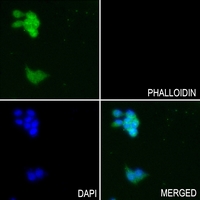 Immunofluorescent analysis of GTF2E2 staining in MCF7 cells. Formalin-fixed cells were permeabilized with 0.1% Triton X-100 in TBS for 5-10 minutes and blocked with 3% BSA-PBS for 30 minutes at room temperature. Cells were probed with the primary antibody in 3% BSA-PBS and incubated overnight at 4 °C in a hidified chamber. Cells were washed with PBST and incubated with a AF488-conjugated secondary antibody (green) in PBS at room temperature in the dark. Phalloidin - AF594 was used to stain Actin filaments (red). DAPI was used to stain the cell nuclei (blue).