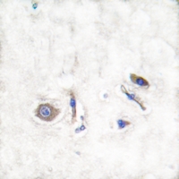 Immunohistochemical analysis of NRAS/HRAS/KRAS staining in human brain formalin fixed paraffin embedded tissue section. The section was pre-treated using heat mediated antigen retrieval with sodium citrate buffer (pH 6.0). The section was then incubated with the antibody at room temperature and detected using an HRP conjugated compact polymer system. DAB was used as the chromogen. The section was then counterstained with haematoxylin and mounted with DPX. -