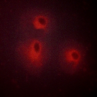 Immunofluorescent analysis of 5-HT1A staining in HeLa cells. Formalin-fixed cells were permeabilized with 0.1% Triton X-100 in TBS for 5-10 minutes and blocked with 3% BSA-PBS for 30 minutes at room temperature. Cells were probed with the primary antibody in 3% BSA-PBS and incubated overnight at 4 °C in a hidified chamber. Cells were washed with PBST and incubated with a AF594-conjugated secondary antibody (red) in PBS at room temperature in the dark.