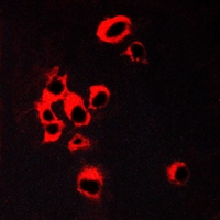 Immunofluorescent analysis of 5-HT2B staining in COS7 cells. Formalin-fixed cells were permeabilized with 0.1% Triton X-100 in TBS for 5-10 minutes and blocked with 3% BSA-PBS for 30 minutes at room temperature. Cells were probed with the primary antibody in 3% BSA-PBS and incubated overnight at 4 °C in a hidified chamber. Cells were washed with PBST and incubated with a AF594-conjugated secondary antibody (red) in PBS at room temperature in the dark.