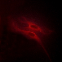 Immunofluorescent analysis of 5-HT4 staining in HeLa cells. Formalin-fixed cells were permeabilized with 0.1% Triton X-100 in TBS for 5-10 minutes and blocked with 3% BSA-PBS for 30 minutes at room temperature. Cells were probed with the primary antibody in 3% BSA-PBS and incubated overnight at 4 °C in a hidified chamber. Cells were washed with PBST and incubated with a AF594-conjugated secondary antibody (red) in PBS at room temperature in the dark.