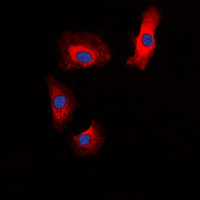 Immunofluorescent analysis of Amylin staining in HeLa cells. Formalin-fixed cells were permeabilized with 0.1% Triton X-100 in TBS for 5-10 minutes and blocked with 3% BSA-PBS for 30 minutes at room temperature. Cells were probed with the primary antibody in 3% BSA-PBS and incubated overnight at 4 °C in a humidified chamber. Cells were washed with PBST and incubated with a DyLight 594-conjugated secondary antibody (red) in PBS at room temperature in the dark. DAPI was used to stain the cell nuclei (blue).