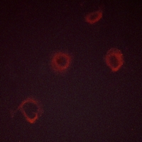 Immunofluorescent analysis of IFNGR1 (Phospho-Y457) staining in A549 cells. Formalin-fixed cells were permeabilized with 0.1% Triton X-100 in TBS for 5-10 minutes and blocked with 3% BSA-PBS for 30 minutes at room temperature. Cells were probed with the primary antibody in 3% BSA-PBS and incubated overnight at 4 °C in a hidified chamber. Cells were washed with PBST and incubated with a AF594-conjugated secondary antibody (red) in PBS at room temperature in the dark.