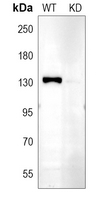 Western blot analysis of CD51 HC expression in wild type (WT) and knockdown (KD) HT1080 cell lysates.
