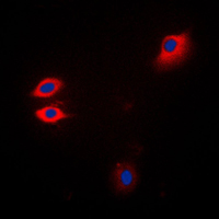 Immunofluorescent analysis of JAK1 staining in Jurkat cells. Formalin-fixed cells were permeabilized with 0.1% Triton X-100 in TBS for 5-10 minutes and blocked with 3% BSA-PBS for 30 minutes at room temperature. Cells were probed with the primary antibody in 3% BSA-PBS and incubated overnight at 4 °C in a humidified chamber. Cells were washed with PBST and incubated with a DyLight 594-conjugated secondary antibody (red) in PBS at room temperature in the dark. DAPI was used to stain the cell nuclei (blue).