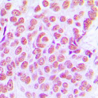 Immunohistochemical analysis of c-Jun staining in human breast cancer formalin fixed paraffin embedded tissue section. The section was pre-treated using heat mediated antigen retrieval with sodium citrate buffer (pH 6.0). The section was then incubated with the antibody at room temperature and detected using an HRP conjugated compact polymer system. DAB was used as the chromogen. The section was then counterstained with haematoxylin and mounted with DPX.