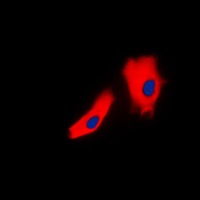 Immunofluorescent analysis of Gamma-catenin staining in A431 cells. Formalin-fixed cells were permeabilized with 0.1% Triton X-100 in TBS for 5-10 minutes and blocked with 3% BSA-PBS for 30 minutes at room temperature. Cells were probed with the primary antibody in 3% BSA-PBS and incubated overnight at 4 °C in a humidified chamber. Cells were washed with PBST and incubated with a DyLight 594-conjugated secondary antibody (red) in PBS at room temperature in the dark. DAPI was used to stain the cell nuclei (blue).