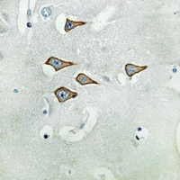 Immunohistochemical analysis of Kv3.1 staining in human brain formalin fixed paraffin embedded tissue section. The section was pre-treated using heat mediated antigen retrieval with sodium citrate buffer (pH 6.0). The section was then incubated with the antibody at room temperature and detected using an HRP conjugated compact polymer system. DAB was used as the chromogen. The section was then counterstained with haematoxylin and mounted with DPX.