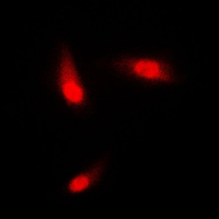 Immunofluorescent analysis of Cytokeratin 8 staining in NIH3T3 cells. Formalin-fixed cells were permeabilized with 0.1% Triton X-100 in TBS for 5-10 minutes and blocked with 3% BSA-PBS for 30 minutes at room temperature. Cells were probed with the primary antibody in 3% BSA-PBS and incubated overnight at 4 °C in a humidified chamber. Cells were washed with PBST and incubated with a DyLight 594-conjugated secondary antibody (red) in PBS at room temperature in the dark.