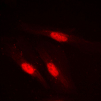 Immunofluorescent analysis of SMAD2 staining in Jurkat cells. Formalin-fixed cells were permeabilized with 0.1% Triton X-100 in TBS for 5-10 minutes and blocked with 3% BSA-PBS for 30 minutes at room temperature. Cells were probed with the primary antibody in 3% BSA-PBS and incubated overnight at 4 °C in a humidified chamber. Cells were washed with PBST and incubated with a DyLight 594-conjugated secondary antibody (red) in PBS at room temperature in the dark.