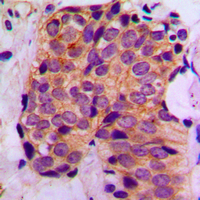 Immunohistochemical analysis of MAGEA1 staining in human breast cancer formalin fixed paraffin embedded tissue section. The section was pre-treated using heat mediated antigen retrieval with sodium citrate buffer (pH 6.0). The section was then incubated with the antibody at room temperature and detected using an HRP conjugated compact polymer system. DAB was used as the chromogen. The section was then counterstained with haematoxylin and mounted with DPX.