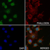 Immunofluorescent analysis of TAU (Phospho-T534) staining in RAW264.7 cells. Formalin-fixed cells were permeabilized with 0.1% Triton X-100 in TBS for 5-10 minutes and blocked with 3% BSA-PBS for 30 minutes at room temperature. Cells were probed with the primary antibody in 3% BSA-PBS and incubated overnight at 4 °C in a hidified chamber. Cells were washed with PBST and incubated with a AF488-conjugated secondary antibody (green) in PBS at room temperature in the dark. Phalloidin - AF594 was used to stain Actin filaments (red). DAPI was used to stain the cell nuclei (blue). -