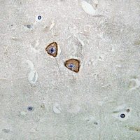 Immunohistochemical analysis of TAU (Phospho-T534) staining in human brain formalin fixed paraffin embedded tissue section. The section was pre-treated using heat mediated antigen retrieval with sodium citrate buffer (pH 6.0). The section was then incubated with the antibody at room temperature and detected using an HRP conjugated compact polymer system. DAB was used as the chromogen. The section was then counterstained with haematoxylin and mounted with DPX. -