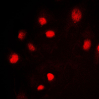 Immunofluorescent analysis of MCM2 staining in Jurkat cells. Formalin-fixed cells were permeabilized with 0.1% Triton X-100 in TBS for 5-10 minutes and blocked with 3% BSA-PBS for 30 minutes at room temperature. Cells were probed with the primary antibody in 3% BSA-PBS and incubated overnight at 4 °C in a humidified chamber. Cells were washed with PBST and incubated with a DyLight 594-conjugated secondary antibody (red) in PBS at room temperature in the dark.