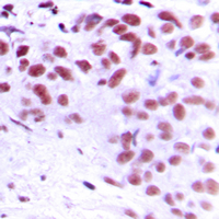 Immunohistochemical analysis of MEOX2 staining in human breast cancer formalin fixed paraffin embedded tissue section. The section was pre-treated using heat mediated antigen retrieval with sodium citrate buffer (pH 6.0). The section was then incubated with the antibody at room temperature and detected using an HRP conjugated compact polymer system. DAB was used as the chromogen. The section was then counterstained with haematoxylin and mounted with DPX.