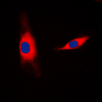 Immunofluorescent analysis of Mammaglobin B staining in HepG2 cells. Formalin-fixed cells were permeabilized with 0.1% Triton X-100 in TBS for 5-10 minutes and blocked with 3% BSA-PBS for 30 minutes at room temperature. Cells were probed with the primary antibody in 3% BSA-PBS and incubated overnight at 4 °C in a humidified chamber. Cells were washed with PBST and incubated with a DyLight 594-conjugated secondary antibody (red) in PBS at room temperature in the dark. DAPI was used to stain the cell nuclei (blue).