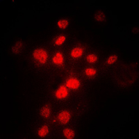 Immunofluorescent analysis of MLH1 staining in HeLa cells. Formalin-fixed cells were permeabilized with 0.1% Triton X-100 in TBS for 5-10 minutes and blocked with 3% BSA-PBS for 30 minutes at room temperature. Cells were probed with the primary antibody in 3% BSA-PBS and incubated overnight at 4 °C in a humidified chamber. Cells were washed with PBST and incubated with a DyLight 594-conjugated secondary antibody (red) in PBS at room temperature in the dark.