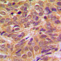 Immunohistochemical analysis of FOXO4 (Phospho-S197) staining in human breast cancer formalin fixed paraffin embedded tissue section. The section was pre-treated using heat mediated antigen retrieval with sodium citrate buffer (pH 6.0). The section was then incubated with the antibody at room temperature and detected using an HRP conjugated compact polymer system. DAB was used as the chromogen. The section was then counterstained with haematoxylin and mounted with DPX. -