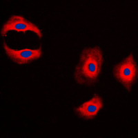 Immunofluorescent analysis of MMP3 staining in A431 cells. Formalin-fixed cells were permeabilized with 0.1% Triton X-100 in TBS for 5-10 minutes and blocked with 3% BSA-PBS for 30 minutes at room temperature. Cells were probed with the primary antibody in 3% BSA-PBS and incubated overnight at 4 °C in a humidified chamber. Cells were washed with PBST and incubated with a DyLight 594-conjugated secondary antibody (red) in PBS at room temperature in the dark. DAPI was used to stain the cell nuclei (blue).