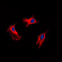 Immunofluorescent analysis of MMP9 staining in HuvEc cells. Formalin-fixed cells were permeabilized with 0.1% Triton X-100 in TBS for 5-10 minutes and blocked with 3% BSA-PBS for 30 minutes at room temperature. Cells were probed with the primary antibody in 3% BSA-PBS and incubated overnight at 4 °C in a humidified chamber. Cells were washed with PBST and incubated with a DyLight 594-conjugated secondary antibody (red) in PBS at room temperature in the dark. DAPI was used to stain the cell nuclei (blue).