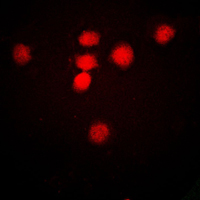 Immunofluorescent analysis of MRE11 staining in HeLa cells. Formalin-fixed cells were permeabilized with 0.1% Triton X-100 in TBS for 5-10 minutes and blocked with 3% BSA-PBS for 30 minutes at room temperature. Cells were probed with the primary antibody in 3% BSA-PBS and incubated overnight at 4 °C in a humidified chamber. Cells were washed with PBST and incubated with a DyLight 594-conjugated secondary antibody (red) in PBS at room temperature in the dark.