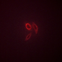 Immunofluorescent analysis of MUC1 (Phospho-Y1229) staining in HepG2 cells. Formalin-fixed cells were permeabilized with 0.1% Triton X-100 in TBS for 5-10 minutes and blocked with 3% BSA-PBS for 30 minutes at room temperature. Cells were probed with the primary antibody in 3% BSA-PBS and incubated overnight at 4 °C in a hidified chamber. Cells were washed with PBST and incubated with a AF594-conjugated secondary antibody (red) in PBS at room temperature in the dark.