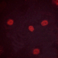 Immunofluorescent analysis of MYBL2 (Phospho-S577) staining in HeLa cells. Formalin-fixed cells were permeabilized with 0.1% Triton X-100 in TBS for 5-10 minutes and blocked with 3% BSA-PBS for 30 minutes at room temperature. Cells were probed with the primary antibody in 3% BSA-PBS and incubated overnight at 4 °C in a hidified chamber. Cells were washed with PBST and incubated with a AF594-conjugated secondary antibody (red) in PBS at room temperature in the dark.