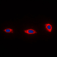 Immunofluorescent analysis of NDUFA4 staining in HeLa cells. Formalin-fixed cells were permeabilized with 0.1% Triton X-100 in TBS for 5-10 minutes and blocked with 3% BSA-PBS for 30 minutes at room temperature. Cells were probed with the primary antibody in 3% BSA-PBS and incubated overnight at 4 °C in a humidified chamber. Cells were washed with PBST and incubated with a DyLight 594-conjugated secondary antibody (red) in PBS at room temperature in the dark. DAPI was used to stain the cell nuclei (blue).