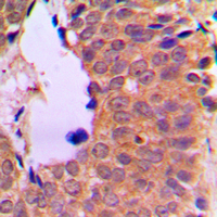 Immunohistochemical analysis of NF-kappaB p100 staining in human breast cancer formalin fixed paraffin embedded tissue section. The section was pre-treated using heat mediated antigen retrieval with sodium citrate buffer (pH 6.0). The section was then incubated with the antibody at room temperature and detected using an HRP conjugated compact polymer system. DAB was used as the chromogen. The section was then counterstained with haematoxylin and mounted with DPX. -