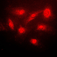 Immunofluorescent analysis of IKB beta (Phospho-S23) staining in PC12 cells. Formalin-fixed cells were permeabilized with 0.1% Triton X-100 in TBS for 5-10 minutes and blocked with 3% BSA-PBS for 30 minutes at room temperature. Cells were probed with the primary antibody in 3% BSA-PBS and incubated overnight at 4 °C in a humidified chamber. Cells were washed with PBST and incubated with a DyLight 594-conjugated secondary antibody (red) in PBS at room temperature in the dark.