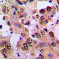 Immunohistochemical analysis of IKB beta (Phospho-S23) staining in human breast cancer formalin fixed paraffin embedded tissue section. The section was pre-treated using heat mediated antigen retrieval with sodium citrate buffer (pH 6.0). The section was then incubated with the antibody at room temperature and detected using an HRP conjugated compact polymer system. DAB was used as the chromogen. The section was then counterstained with haematoxylin and mounted with DPX. -