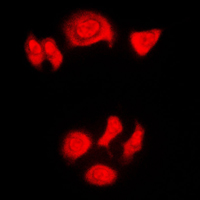 Immunofluorescent analysis of Nucleophosmin (Phospho-T199) staining in HeLa cells. Formalin-fixed cells were permeabilized with 0.1% Triton X-100 in TBS for 5-10 minutes and blocked with 3% BSA-PBS for 30 minutes at room temperature. Cells were probed with the primary antibody in 3% BSA-PBS and incubated overnight at 4 °C in a humidified chamber. Cells were washed with PBST and incubated with a DyLight 594-conjugated secondary antibody (red) in PBS at room temperature in the dark.