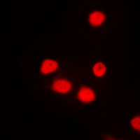 Immunofluorescent analysis of SIX6 staining in NIH3T3 cells. Formalin-fixed cells were permeabilized with 0.1% Triton X-100 in TBS for 5-10 minutes and blocked with 3% BSA-PBS for 30 minutes at room temperature. Cells were probed with the primary antibody in 3% BSA-PBS and incubated overnight at 4 °C in a humidified chamber. Cells were washed with PBST and incubated with a DyLight 594-conjugated secondary antibody (red) in PBS at room temperature in the dark.