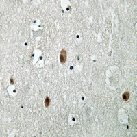 Immunohistochemical analysis of PAK3 (Phospho-S154) staining in human brain formalin fixed paraffin embedded tissue section. The section was pre-treated using heat mediated antigen retrieval with sodium citrate buffer (pH 6.0). The section was then incubated with the antibody at room temperature and detected using an HRP conjugated compact polymer system. DAB was used as the chromogen. The section was then counterstained with haematoxylin and mounted with DPX.