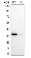 Western blot analysis of PCNA expression in wild type (WT) and knockdown (KD) HeLa cell lysates.
