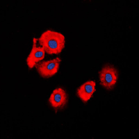 Immunofluorescent analysis of Serpin B5 staining in HeLa cells. Formalin-fixed cells were permeabilized with 0.1% Triton X-100 in TBS for 5-10 minutes and blocked with 3% BSA-PBS for 30 minutes at room temperature. Cells were probed with the primary antibody in 3% BSA-PBS and incubated overnight at 4 °C in a humidified chamber. Cells were washed with PBST and incubated with a DyLight 594-conjugated secondary antibody (red) in PBS at room temperature in the dark. DAPI was used to stain the cell nuclei (blue).