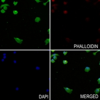 Immunofluorescent analysis of PI3K C2 gamma staining in PANC1 cells. Formalin-fixed cells were permeabilized with 0.1% Triton X-100 in TBS for 5-10 minutes and blocked with 3% BSA-PBS for 30 minutes at room temperature. Cells were probed with the primary antibody in 3% BSA-PBS and incubated overnight at 4 °C in a hidified chamber. Cells were washed with PBST and incubated with a AF488-conjugated secondary antibody (green) in PBS at room temperature in the dark. Phalloidin - AF594 was used to stain Actin filaments (red). DAPI was used to stain the cell nuclei (blue).