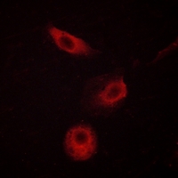 Immunofluorescent analysis of PLC gamma 2 (Phospho-Y1217) staining in HeLa cells. Formalin-fixed cells were permeabilized with 0.1% Triton X-100 in TBS for 5-10 minutes and blocked with 3% BSA-PBS for 30 minutes at room temperature. Cells were probed with the primary antibody in 3% BSA-PBS and incubated overnight at 4 °C in a hidified chamber. Cells were washed with PBST and incubated with a AF594-conjugated secondary antibody (red) in PBS at room temperature in the dark.